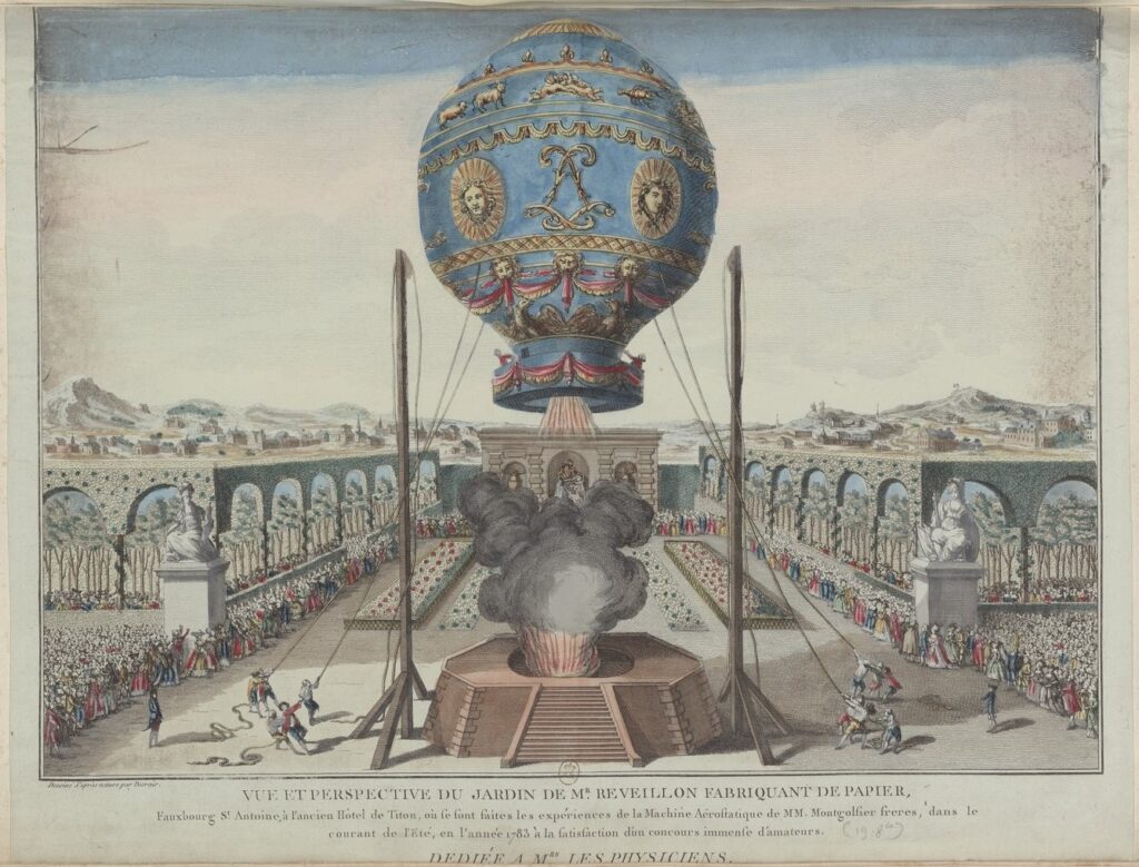 Les frères Montgolfier ont lancé leur première montgolfière sans pilote à Annonay, et leur première montgolfière avec pilote, celle-ci, à Paris (Photo Wikimedia Commons).
