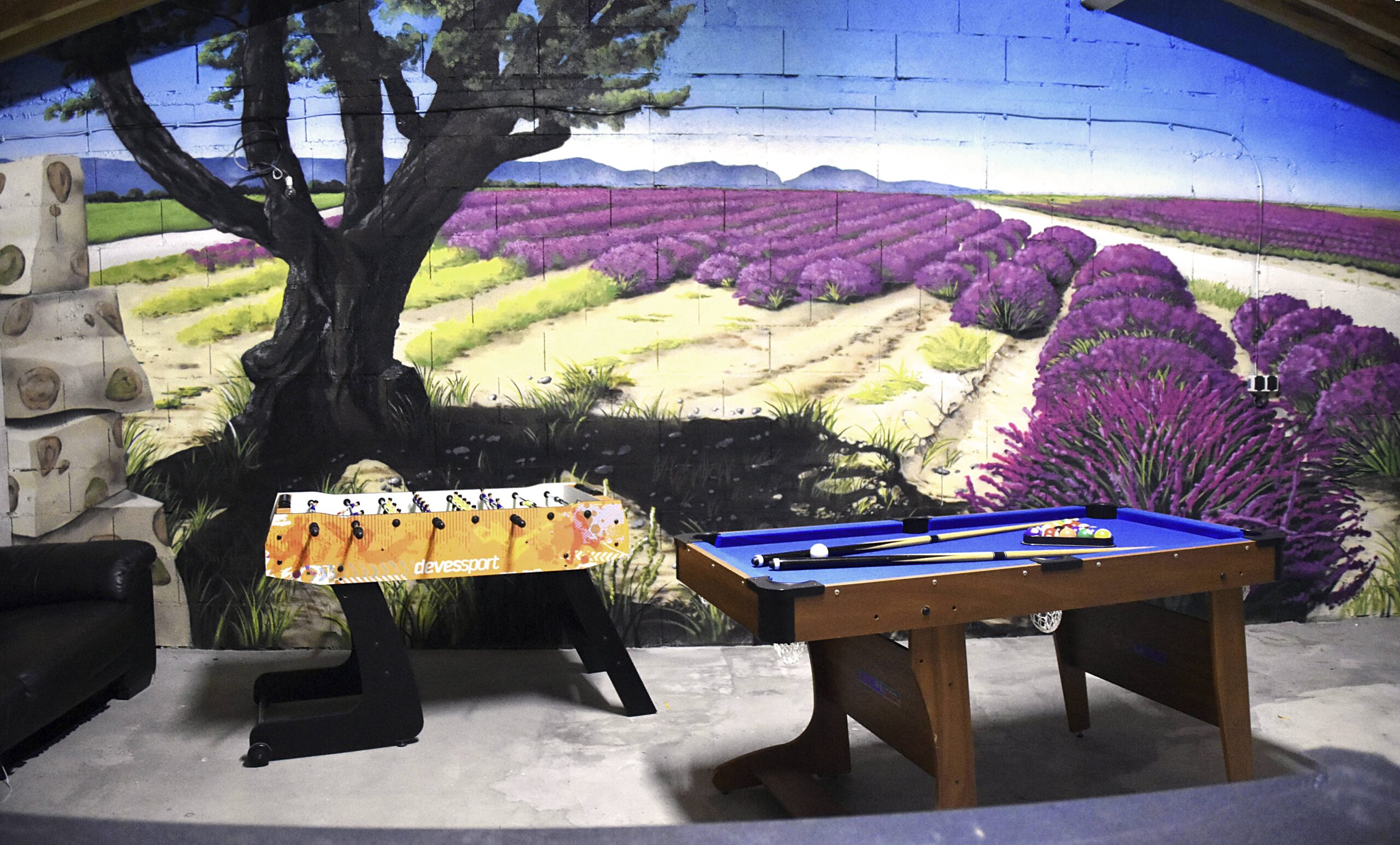 -Salle de jeux exclusive pour petits et grands avec billard, baby-foot, fléchettes, livres, jeux enfants, fresque provençale immersive et espace détente.