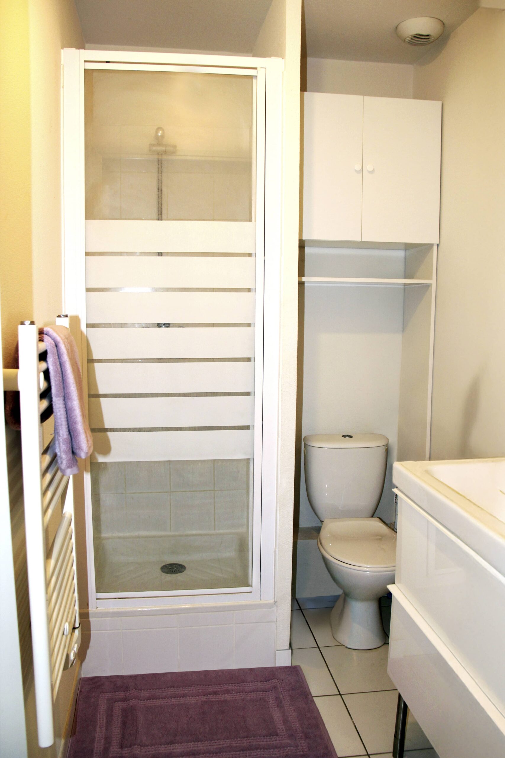 -la salle de bain est fonctionnelle, avec douche, WC et rangements.